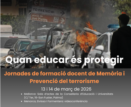 Els dies 13 i 14 de març es duran a terme les jornades Quan educar és protegir. Jornades de formació docent de Memòria i Prevenció del terrorisme, organitzades pel Servei de Formació Permanent del Professorat de la Direcció General d’Universitats, Recerca i Ensenyaments Artístics Superiors. Aquestes Jornades van dirigides a tots els docents d’educació primària, secundaria, formació professional, ensenyaments de persones adultes i ensenyaments de règim especial de les Illes Balears.